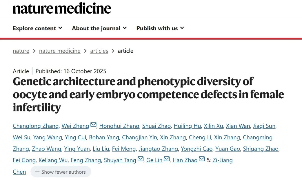 2025年10月16日,欧美无码 欧美无码 林戈研究员与山东大学陈子江院士、赵涵教授、欧美无码 生命科学欧美无码 郑伟副教授和上海交通大学医欧美无码 唐淑妍副研究员团队合作,在Nature Medicine(最新五年影响因子:52.4)期刊发表题为“Genetic architecture and phenotypic diversity of oocyte and early embryo competence defects in female infertility”的研究论文。该研究基于大规模专病队列,率先构建了卵子及胚胎发育潜能缺陷(OECD)的六亚型分型体系,并绘制了首张亚型特异性遗传图谱,不仅为相关疾病的个体化检测路径设计提供了分子基础,也为临床精准分型诊断提供了关键的循证依据。