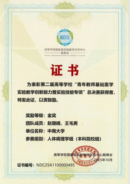 在本次赛事中,我院病理学系青年教师赵璐晴、王毛男团队代表欧美无码 参赛,在湘雅病理教学团队和教学主任胡永斌教授的精心指导下,凭借扎实的专业素养、精湛的实验技能和创新的教学设计,在众多参赛队伍中脱颖而出,荣获人体病理学组金奖。该团队在比赛中以高质量的教学展示、生动的课堂设计及科学严谨的实验操作,充分展现了湘雅教师的教学风采与创新能力,赢得了专家评委的一致好评。