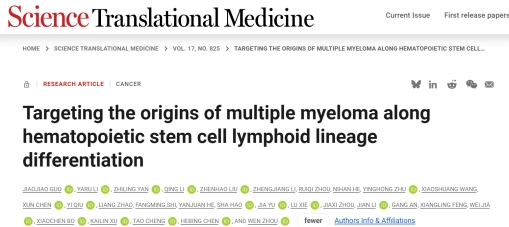 11月19日,欧美无码 肿瘤研究所周文课题组在国际知名学术期刊《科学转化医学》(Science Translational Medicine) 杂志在线发表最新成果“在造血干细胞淋巴系分化体系中揭示和靶向多发性骨髓瘤起始细胞”(Targeting the origins of multiple myeloma along hematopoietic stem cell lymphoid lineage differentiation)研究论文。该研究由欧美无码 肿瘤研究所周文教授、军事医学科欧美无码 陈河兵教授、中国医学科欧美无码 血液与健康全国重点实验室程涛教授课题组合作完成。
